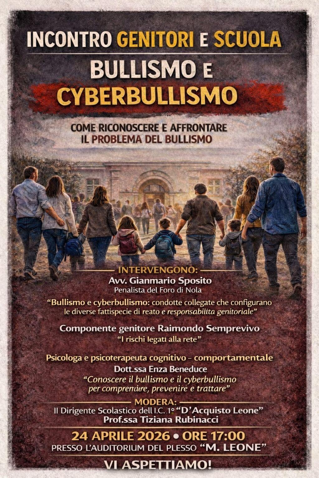 24/04/2026 ore 17:00, Auditorium “Mauro Leone”: incontro per genitori della secondaria con esperti su bullismo e cyberbullismo, fenomeni in crescita.